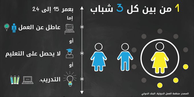 وأشارت مدوّنة نشرت على موقع "البنك الدولي" إلى أنّ ثلث شباب العالم عاطلون عن العمل ولا يحصلون على التعليم أو التدريب. ومن بين المليار شاب الذين سيدخلون سوق العمل في العقد القادم، فقط 40% يُتوقع أن يحصلوا على وظائف متوفرة حالياً. وسيحتاج الاقتصاد العالمي إلى خلق 600 مليون فرصة عمل في السنوات العشر المقبلة لمواكبة المعدلات المتوقعة لتوظيف الشباب.